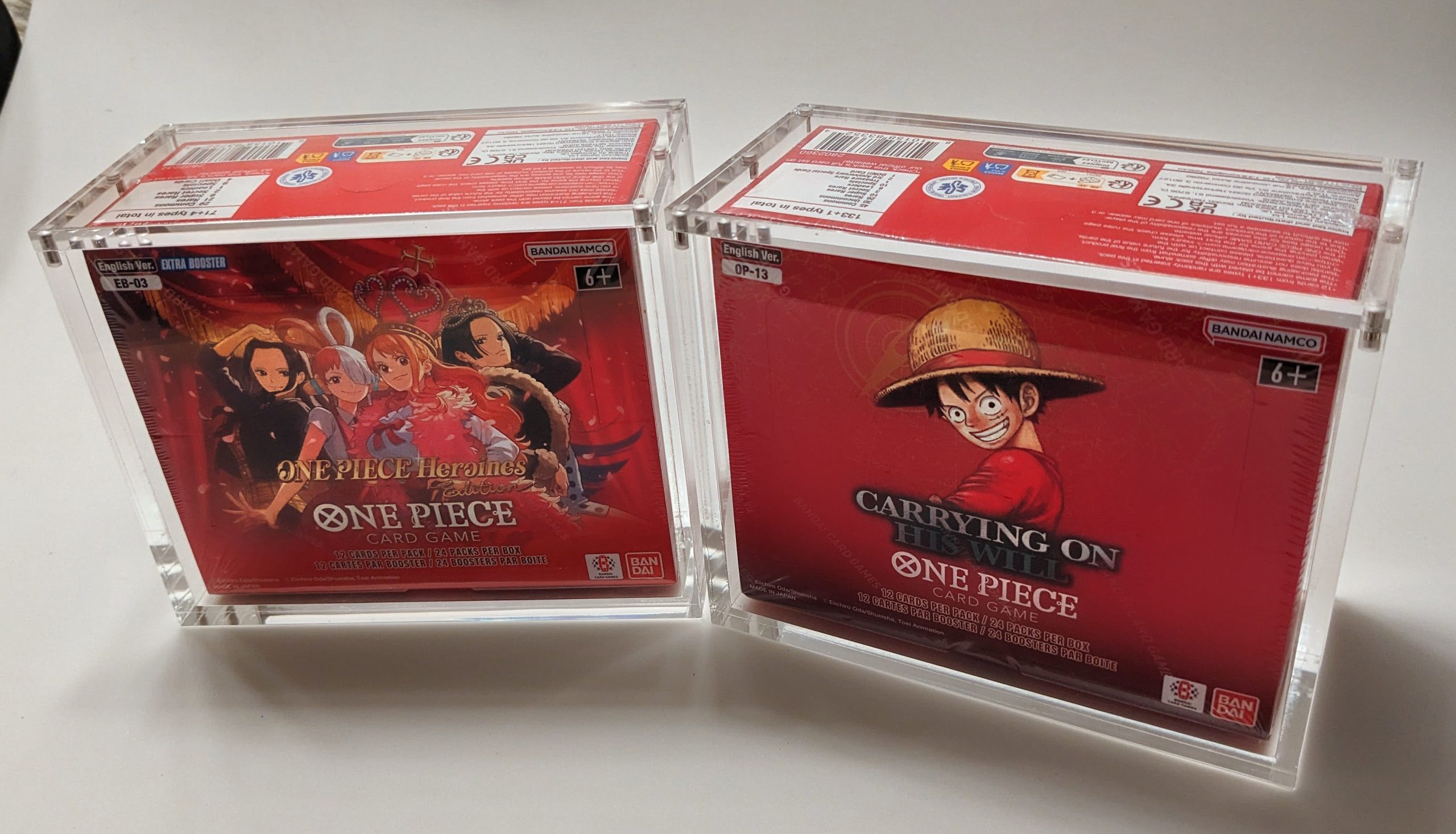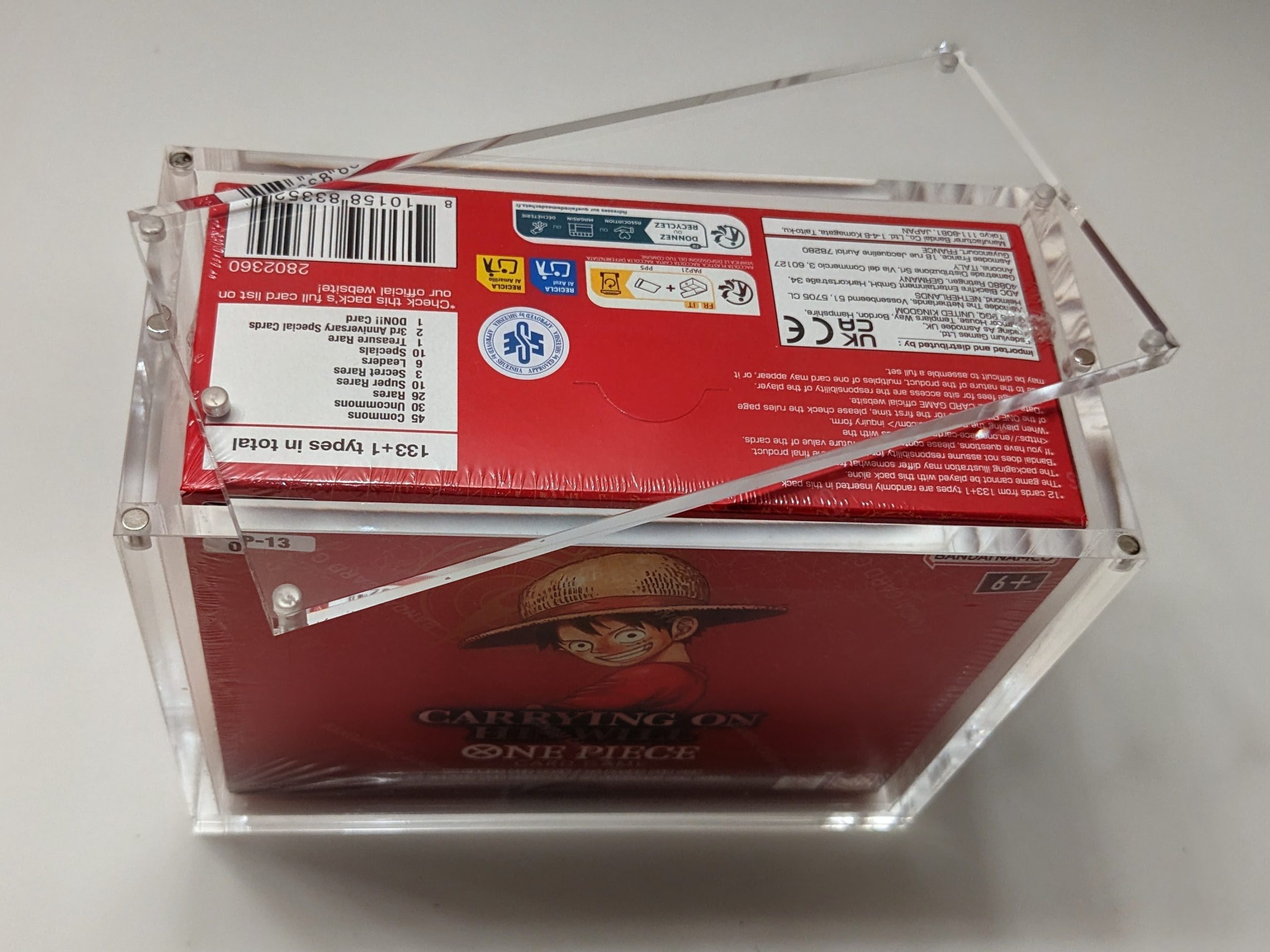 Our acrylic display cases are the perfect protection for the One Piece booster boxes in your collection! Each wall is 6mm acrylic with a 6mm lid that features 6 strong magnets to keep your booster box protected and free from dust. Please note, the booster box displayed in photos is not included.